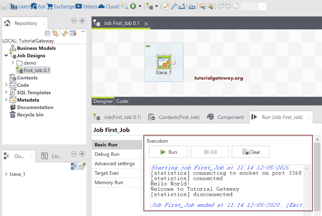 您可以通过点击Run选项卡中的Run按钮,或者点击工具栏上的小播放按钮来运行此Job。从下面的截图可以看出,Job已成功运行,您也可以看到打印的消息!