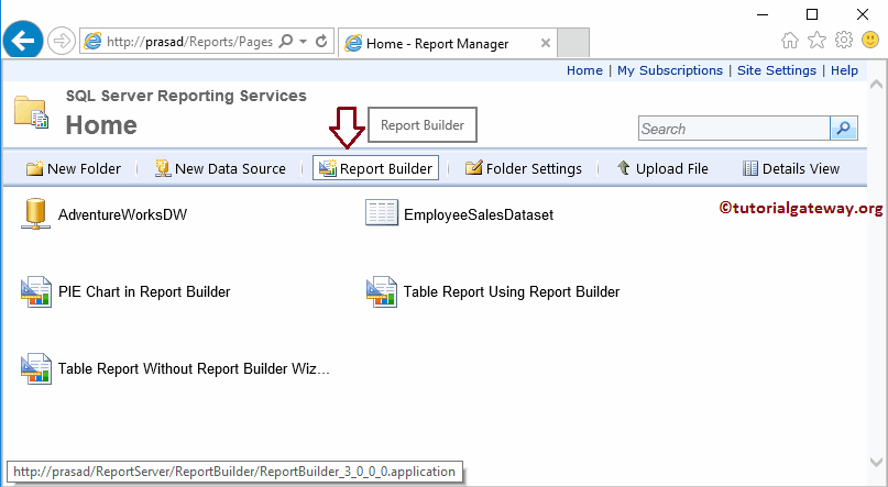 要创建条形图或任何图表,我们必须打开 SSRS 报表生成器。为此,请打开您的报表管理器并单击“报表生成器”按钮,如下图所示。