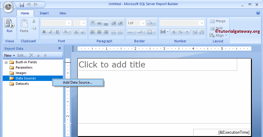 要创建数据源,请右键单击“报表数据”窗格中的“数据源”文件夹。接下来,从上下文菜单中选择“添加数据源”选项。