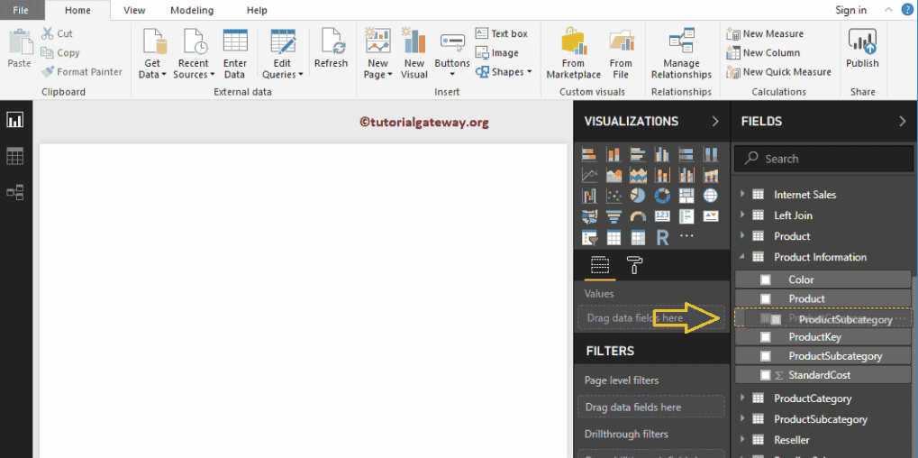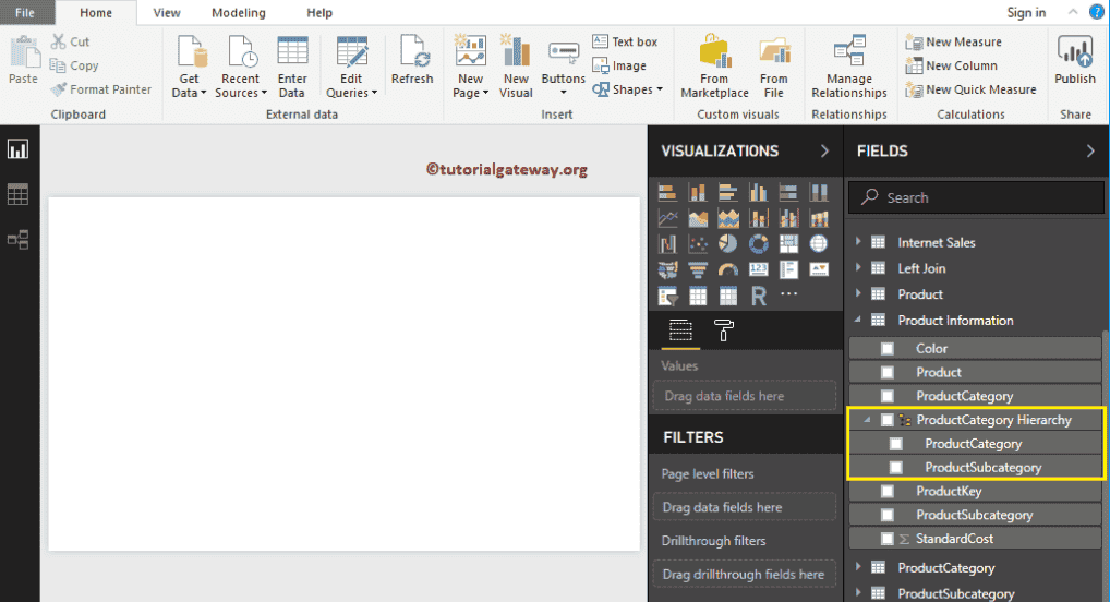 要创建新的层级结构,请将一个字段拖放到另一个字段上。它会自动为您创建层级结构。为了在Power BI中进行演示,我们将产品子类别拖到产品类别字段上。