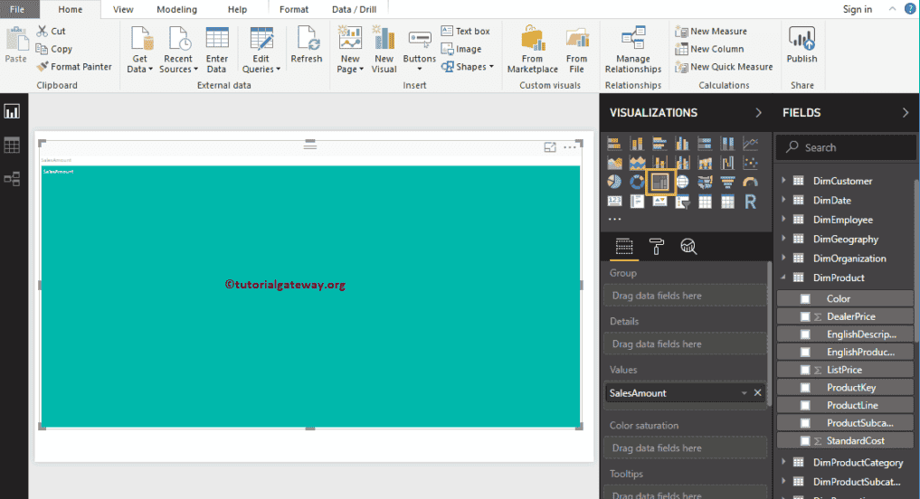 要创建树状图,首先,将“销售额”从“字段”部分拖放到“画布”上。然后,它会自动创建一个柱形图。请参阅连接到 SQL Server 和图表文章以了解Power BI 数据源。