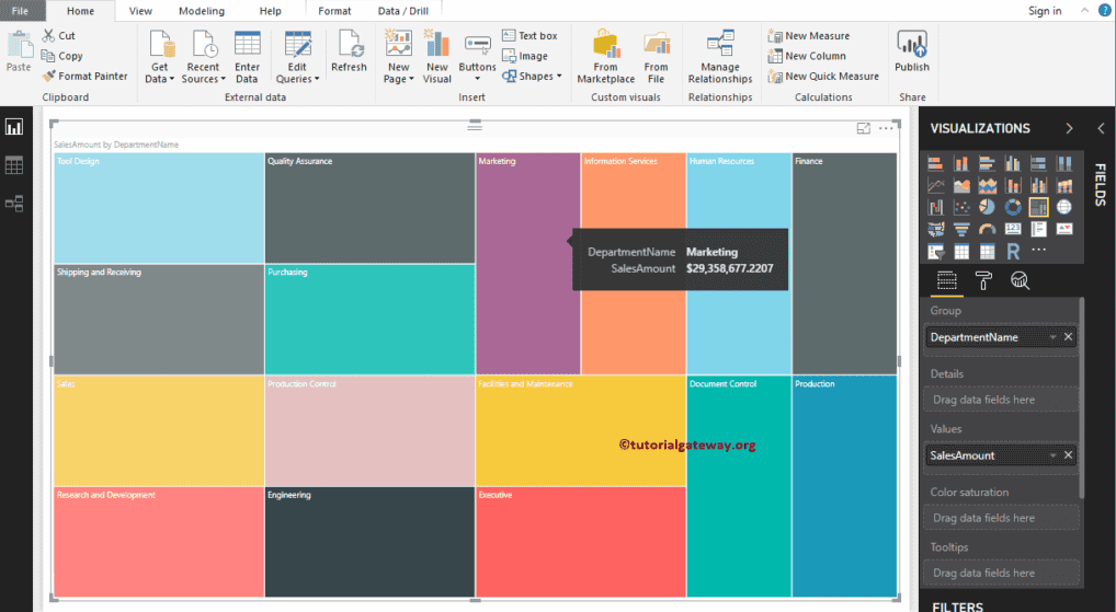 现在您可以看到按员工部门名称划分的销售额树状图。将鼠标悬停在任何框上,都会显示部门名称及其销售额的工具提示。