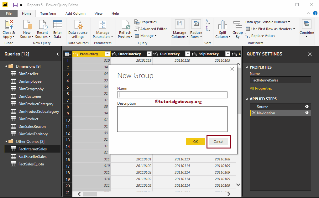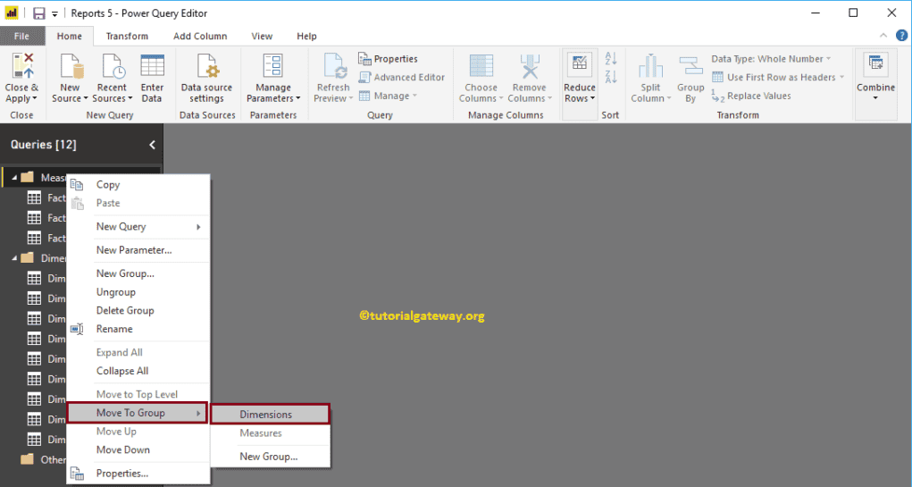 例如,将维度表放在一个组中,将事实表放在另一个组中。要对现有表创建查询组,请在“主页”选项卡下单击“编辑查询”选项。