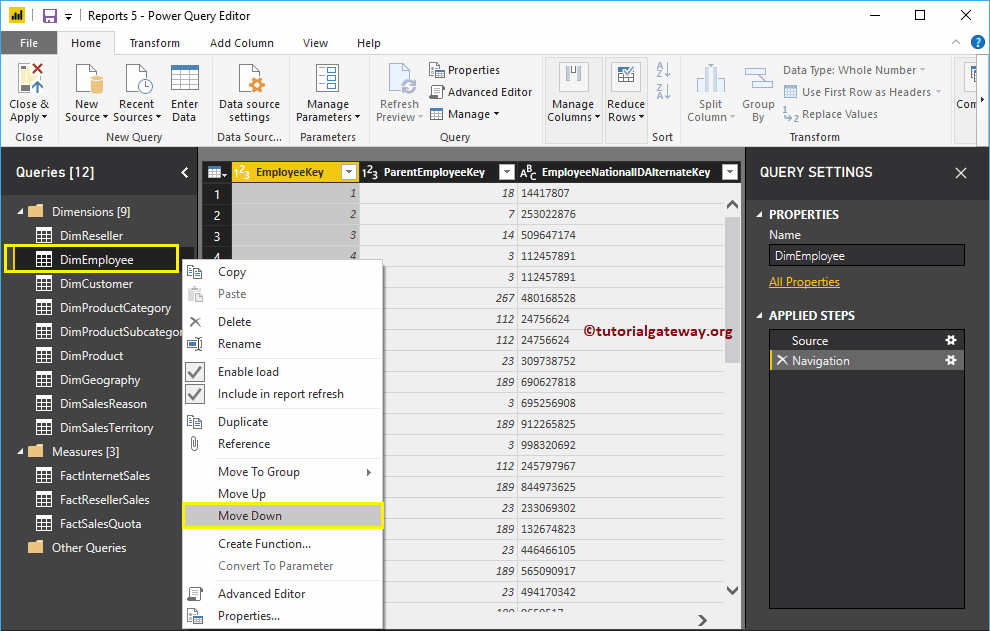 或者,右键单击要移动的表以打开上下文菜单。请选择“下移”或“上移”选项。出于演示目的,我们将 Dim Employee 表向下移动。