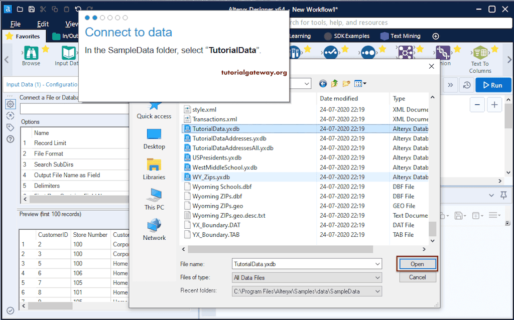 选择文件按钮:请单击此按钮选择所需文件。此处,我们遵循 Alteryx Designer 导览,因此请选择 TutorialData(如工具提示中所述)。