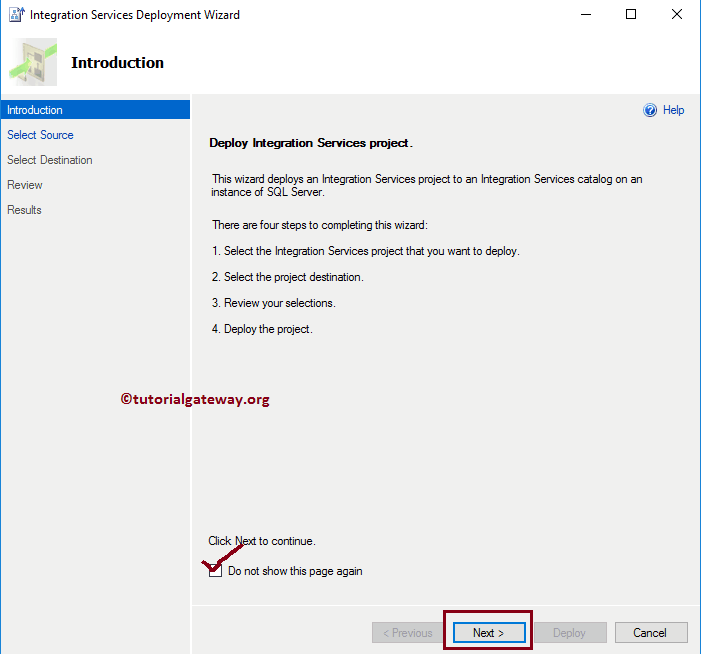 选择选项后,将打开一个新的 Integration Services Deployment Wizard 窗口。这是一个介绍页面,通过单击“不再显示此页面”,您可以避免显示此页面。