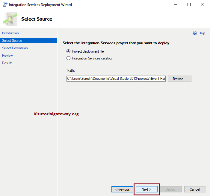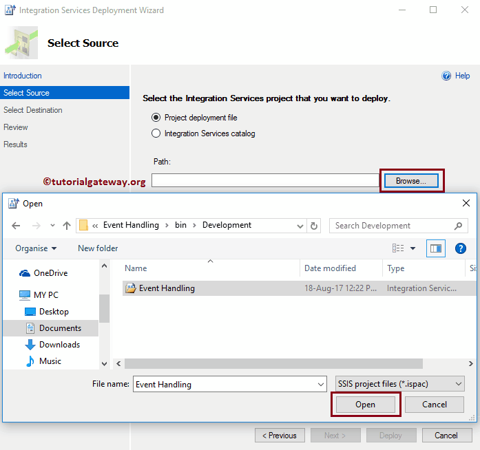 从下面的屏幕截图中,您可以看到我们正在选择 .ispac 类型的 Event handling 项目文件