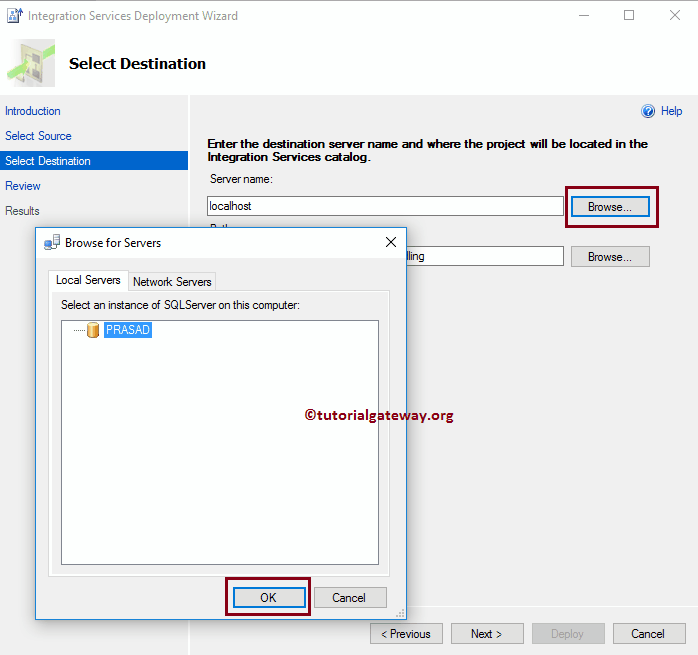 选择目标:此页面用于指定将 SSIS 包使用 SQL Server 部署到的目标位置