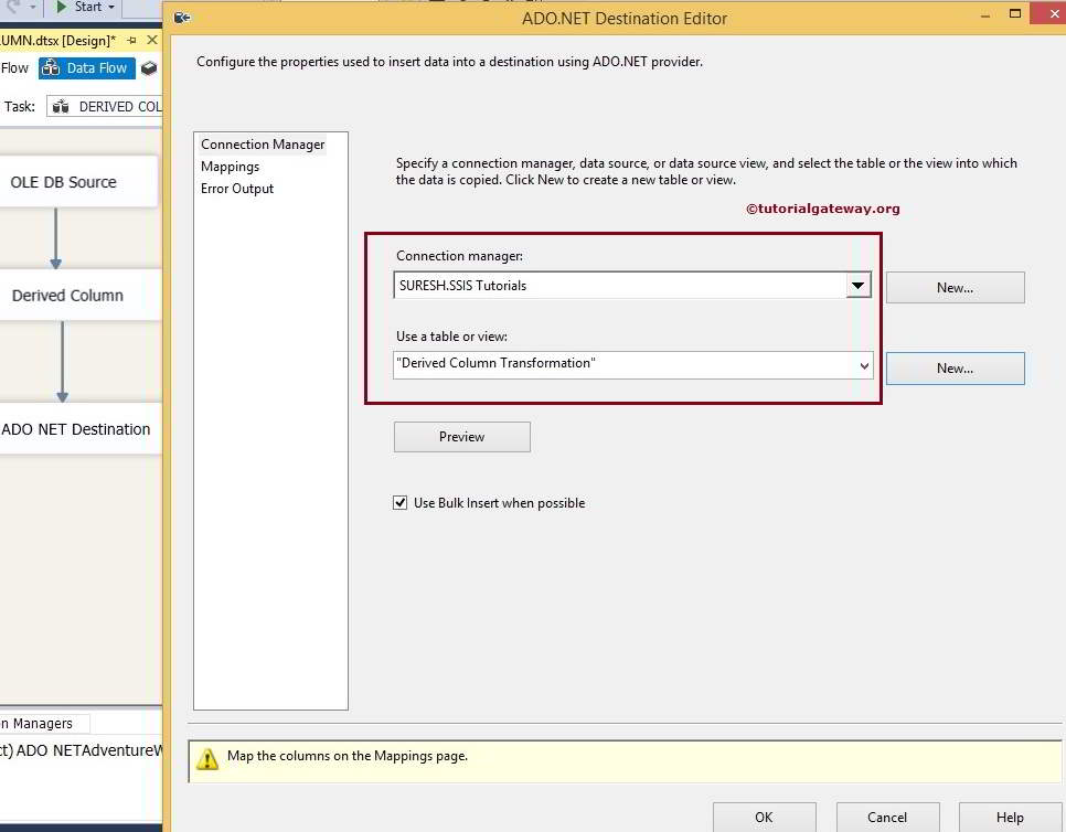 点击“确定”完成 SSIS 中派生列转换的配置。接下来,将蓝色箭头拖到 ADO.NET 目标。