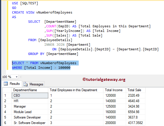 -- Difference between CTE, Temp Tables, Derived tables , and Table variable SELECT * FROM ( SELECT [DepartmentName] ,COUNT(EmpID) AS [Total Employees in this Department] ,SUM([YearlyIncome]) AS [Total Income] ,SUM([Sales]) AS [Total Sale] FROM [EmployeeDetails] INNER JOIN [Department] ON [EmployeeDetails].[DeptID] = [Department].[DeptID] GROUP BY [DepartmentName] ) AS [Derived Employee Details] WHERE [Total Income] > 100000