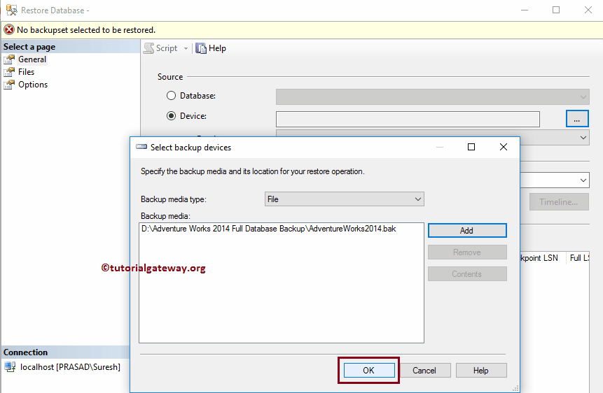 从下面的截图中,您可以看到我们正在选择文件系统中存在的 AdventureWorks.bak 文件。