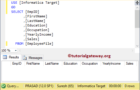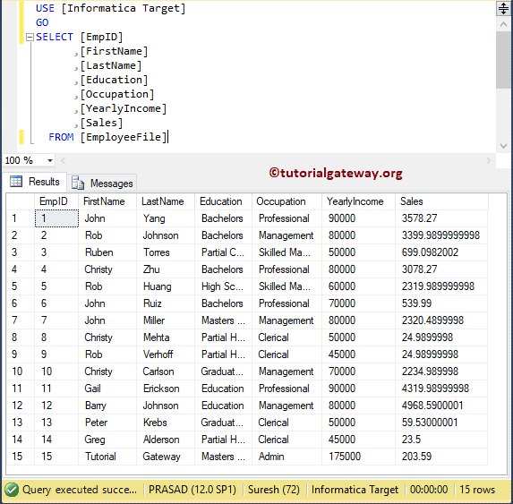 对于这个 Informatica 事件等待任务示例,我们将使用以下显示的文件数据(员工表)。从下面的屏幕截图中,您可以看到源表有 15 条记录。