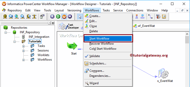 现在,让我开始 Informatica 事件等待任务工作流。为此,请导航到“工作流”菜单并选择“启动工作流”选项。