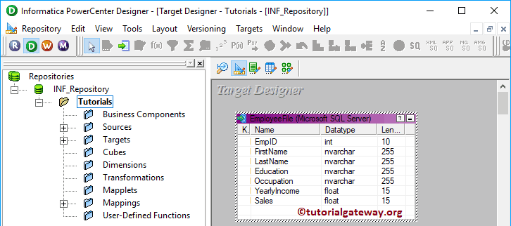 接下来,将目标定义(员工文件)从“目标”文件夹拖放到映射设计器。然后,使用“自动链接..”选项将源限定符连接到目标定义。