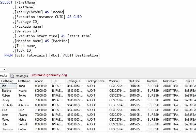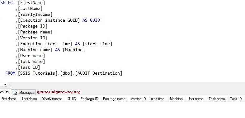 您可以在下面的截图中看到 [Audit Destination] 表是空的。如果不是,请使用 T-SQL 截断该表或添加一个执行 SQL 任务。