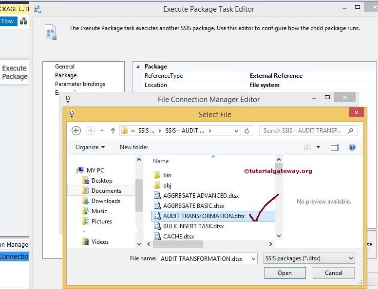 从下面的截图中,您可以看到我们从SSIS程序包列表中选择了 AUDIT TRANSFORMATION。