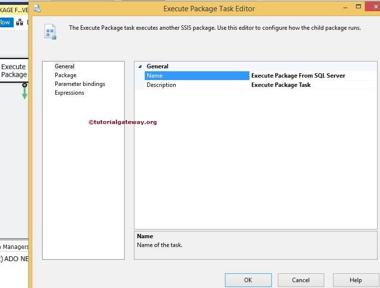 双击执行包任务以配置包。在“常规”选项卡中,我们可以更改名称和描述。目前,我们将名称从 SQL Server 更改为执行包任务。
