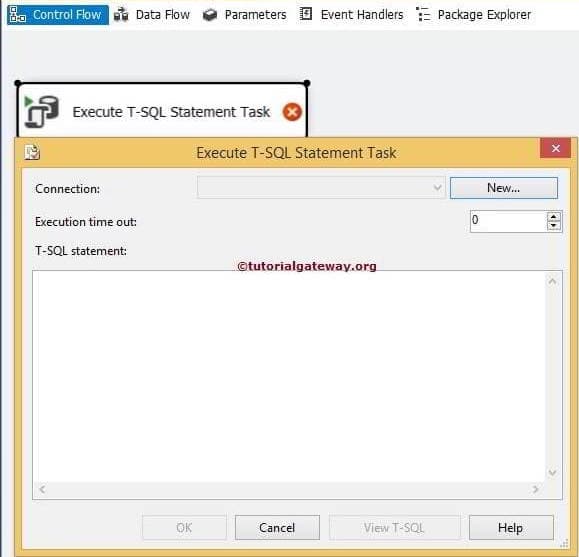 双击该任务将打开 SSIS“执行 T-SQL 语句任务”编辑器进行配置。