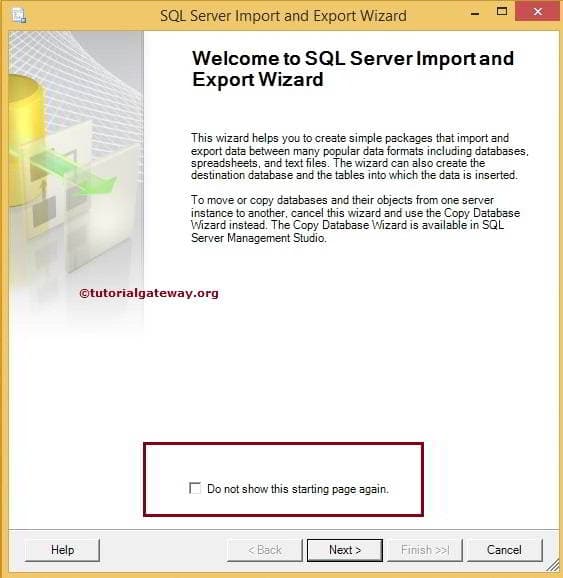 要使用 SSIS 导入导出向导将数据从 SQL Server 导出到 Excel,请双击“导入和导出向导”工具。您可以在“开始”->“所有程序”->“Microsoft SQL Server 2014”->“导入和导出数据”中找到它。它将打开“导入和导出数据”向导。第一页是欢迎页面