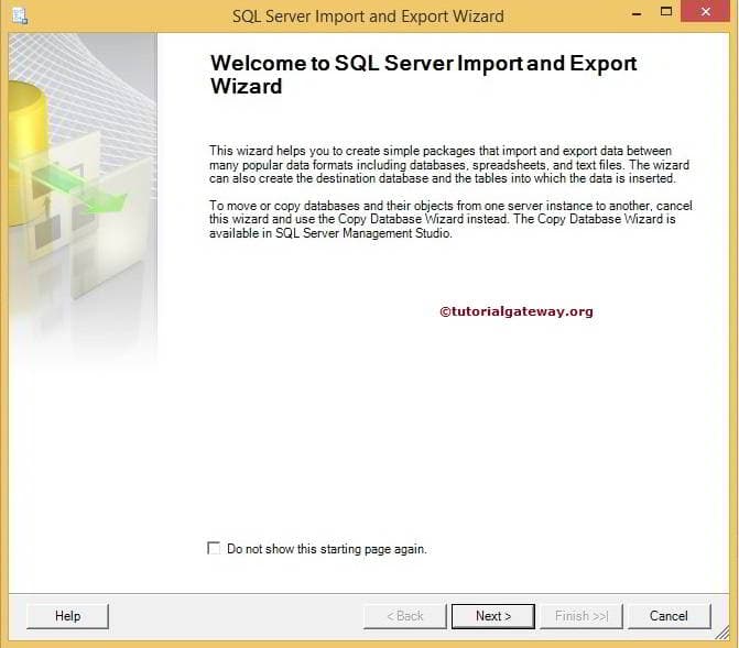 要使用 SSIS 导入和导出向导将 SQL Server 数据导出到平面文件,请双击“导入和导出向导”工具,您可以在“开始”->“所有程序”中找到它。它将打开 SQL Server 导入和导出数据向导。第一页是欢迎页面