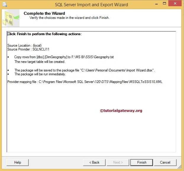 SQL Server 中有导入和导出向导,可以使用该向导将数据从各种 SSIS 源平面文件导入或导出到不同的目标。在此示例中,我们将把 Adventure Works DW 2014 数据库中存在的 DimGeography 表数据导出到本地硬盘上的 Geography 文本文件。