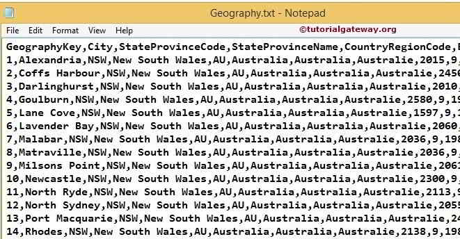 让我们导航到我们提供的文件系统地址,并检查文件名 Geography。双击文本文件以查看结果。我们已经成功使用 SSIS 导入和导出将 SQL Server 数据导出到平面文件。向导。