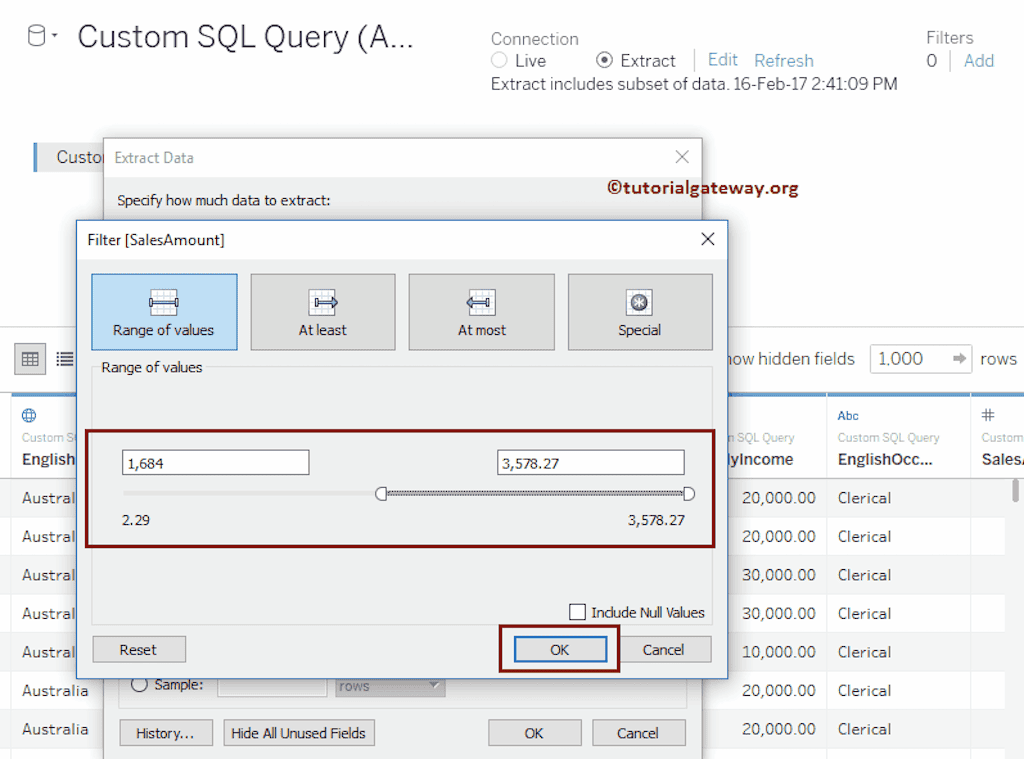 选择“销售额”度量字段后,将打开一个名为“过滤器”的新窗口来创建过滤器条件。为了演示,我们保留最大值,并将最小值更改为 1,684。然后,单击“确定”关闭“提取过滤器数据”窗口。