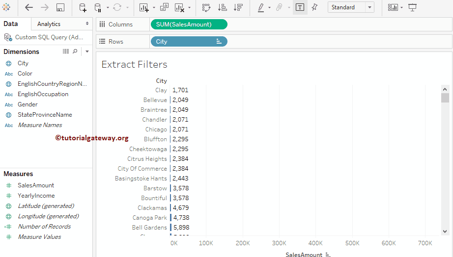 让我们创建一个示例报表,以显示我们新创建的提取过滤器是否正常工作。为此,请将维度区域中的“城市”拖放到“行”架上,并将度量区域中的“销售额”拖放到“列”架上。