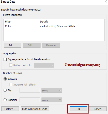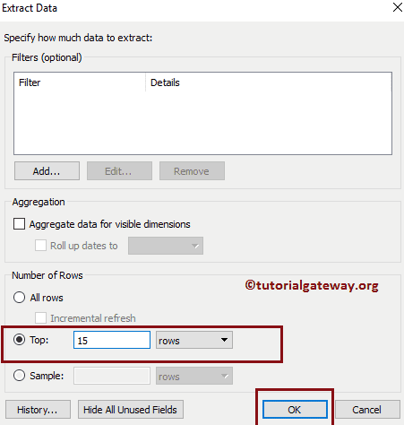 从下面的屏幕截图中,我们将选择“前 15 行”作为 Tableau 提取过滤器条件。