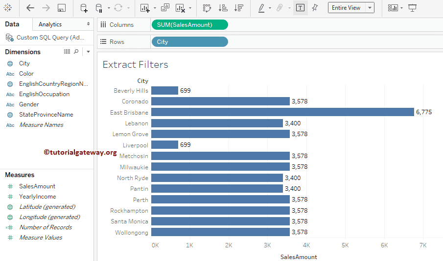 如果查看数据源,由于提取过滤器,它只会显示 15 行。我将通过将维度区域中的“城市”拖放到“行”架上,并将度量区域中的“销售额”拖放到“列”架上来创建一个示例报表。正如您所见,它显示了 14 条记录,因为在最初的 15 行中,“East Brisbane”城市重复了两次。
