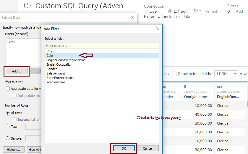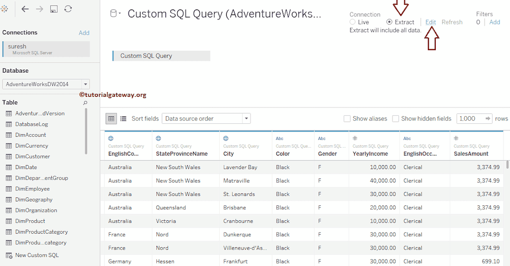 在此提取过滤器演示中,我们将在 Adventure Works DW 数据库上编写自定义 SQL 查询。我们在上述 Tableau 提取过滤器数据源中使用的自定义 SQL 查询是