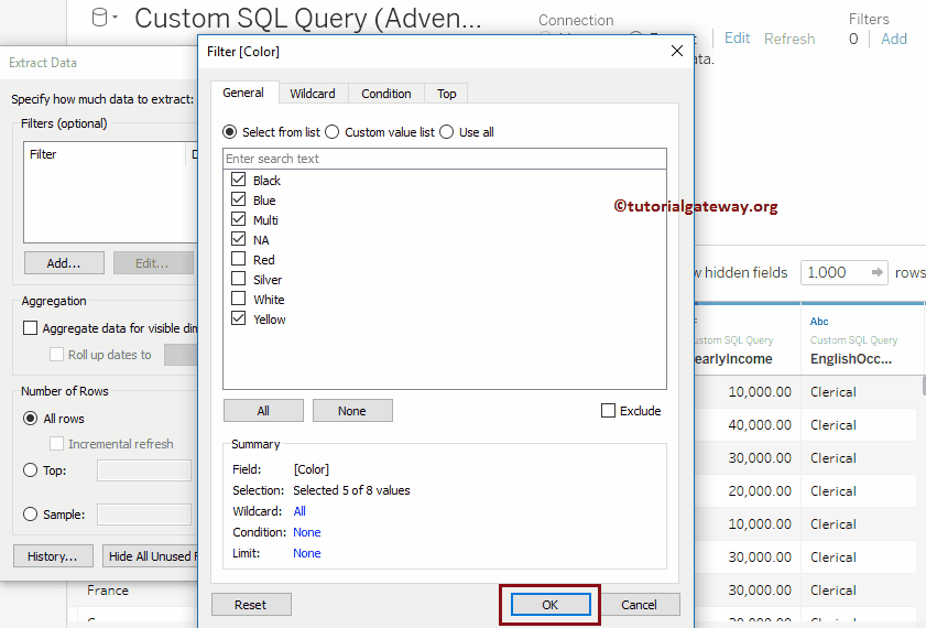 选择“颜色”维度字段后,将打开一个名为“过滤器”的新窗口。在这里,我们选择黑色、蓝色、多色、NA 和黄色。这意味着数据源获取颜色为黑色、蓝色、多色、NA 或黄色的数据。