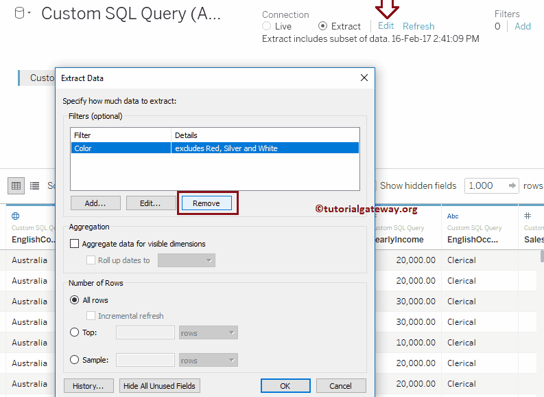 移除提取过滤器很容易。为此,请转到数据源中的“连接”部分,然后单击旁边的“编辑”超链接。它会打开该数据源上可用提取过滤器的列表。请选择所需的过滤器,然后单击“移除”按钮。