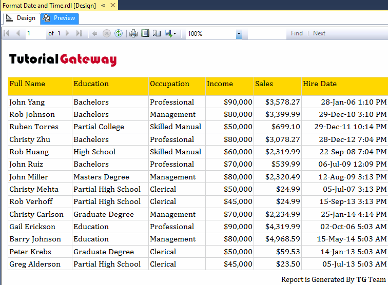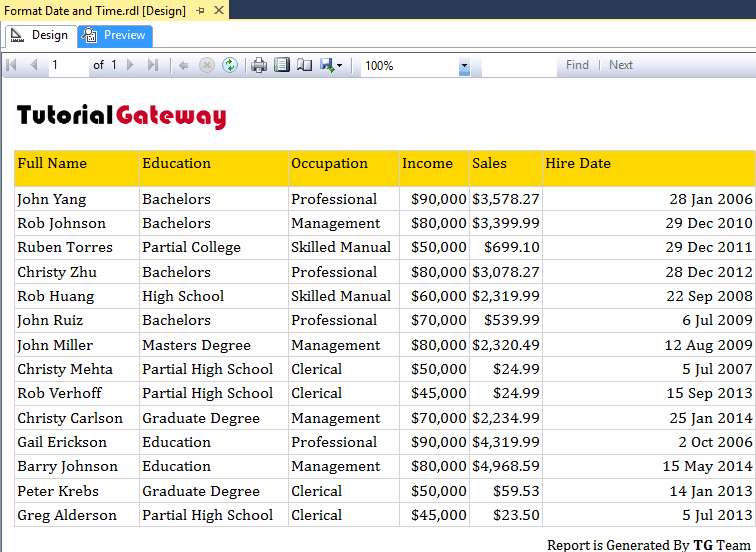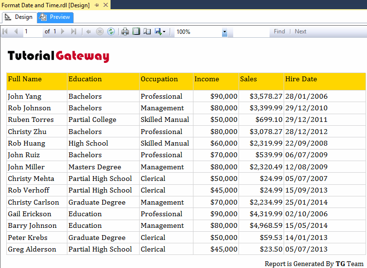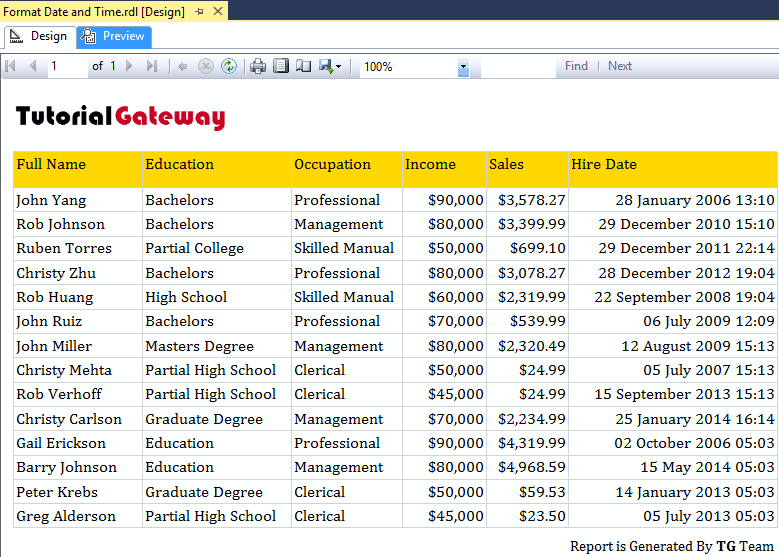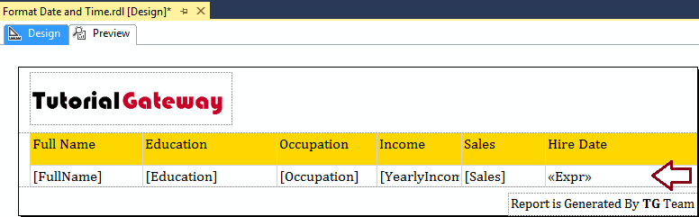 我将向您展示报表预览。在这里,我们的任务是格式化报表中的“入职日期”列。我们有两种方法可以格式化 SSRS 中的日期和时间:一种是使用文本框属性,另一种是使用表达式。我将在下面解释第一种方法,稍后我们将展示第二种方法。