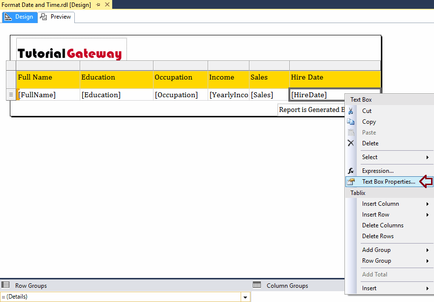 要格式化日期,请选择包含日期值的文本框。在此示例中,选择报表的“入职日期”文本框,右键单击它将打开上下文菜单。请从中选择“文本框属性.” 选项。