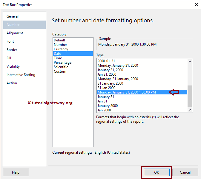 单击“文本框属性.” 选项后,将打开一个新的“文本框属性”窗口。请选择“数字”选项卡,然后选择“日期”类别。