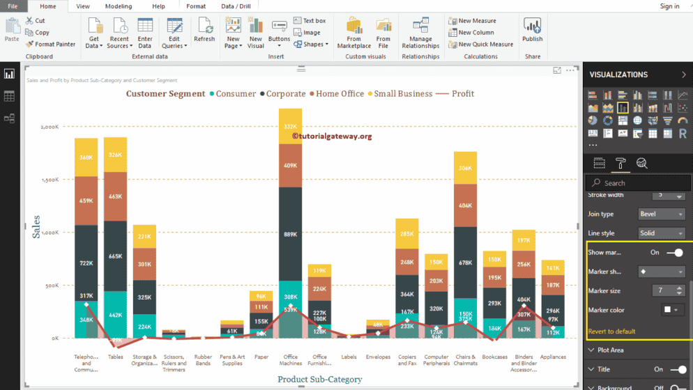 数据标签显示度量值(组的销售金额和每个点的利润)。正如您从下面的截图看到的,我们启用了数据标签并将颜色更改为白色。