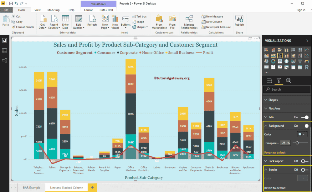 默认情况下,折线和堆积组合图使用默认颜色来填充堆积柱和折线。我将为演示目的更改它们。