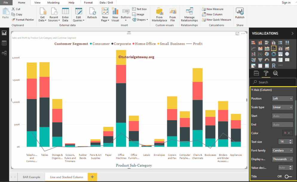 正如您所见,我们将 Y 轴标签的颜色更改为棕色,字体样式更改为 Candara,文本大小更改为 14,显示单位设置为千。