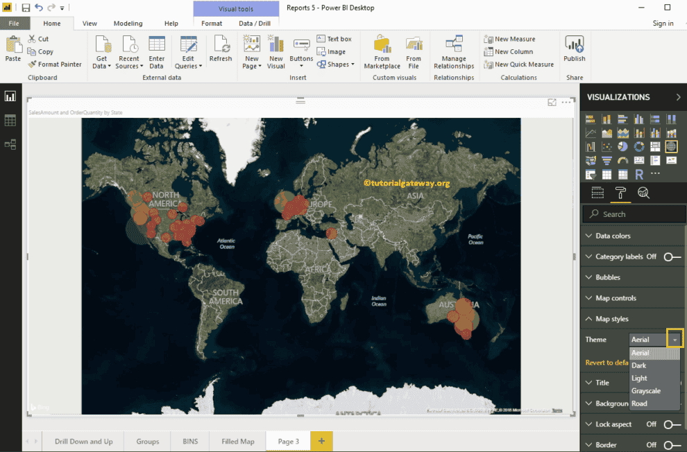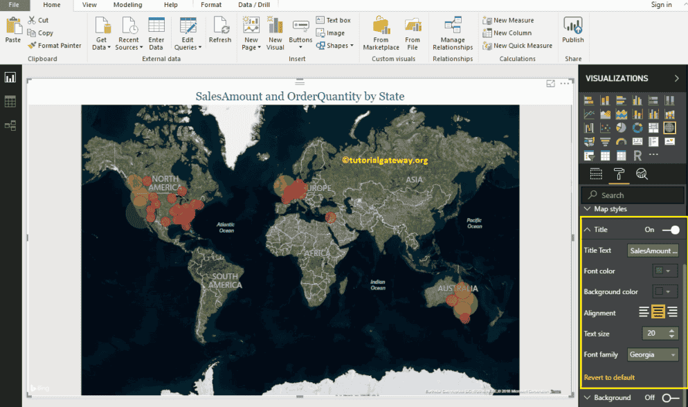 如何通过示例格式化地图?格式化 Power BI 地图包括更改气泡大小、颜色、地图标题文本、标题位置、背景颜色等。