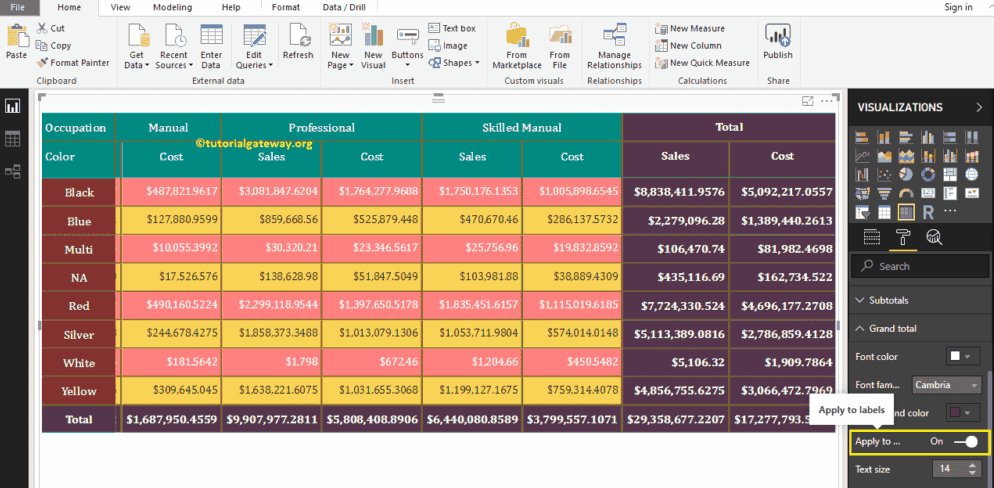 应用于标签(Apply to labels):通过将此选项切换为“开”,将背景颜色应用于总计标题。正如您所看到的,Power BI 已更改了总计标题文本的背景颜色。