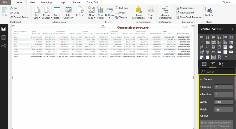 您可以通过将“矩阵”选项从“关”切换到“开”来启用矩阵标题。从下面的屏幕截图中可以看到,我们添加了标题文本“按产品颜色和职业划分的销售额与产品总成本”。