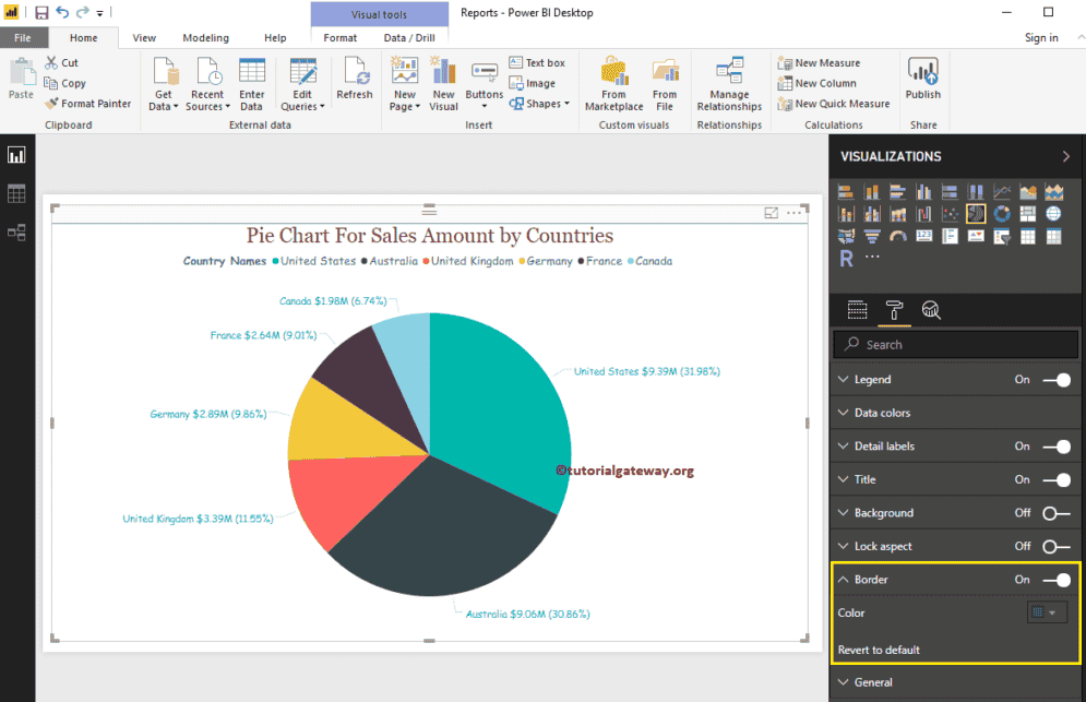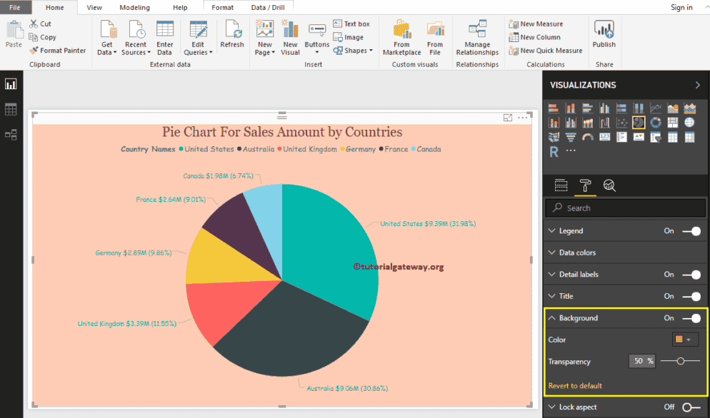 如何使用示例格式化 Power BI 饼图? 格式化饼图包括更改图例和标题的位置、扇区和背景颜色等。