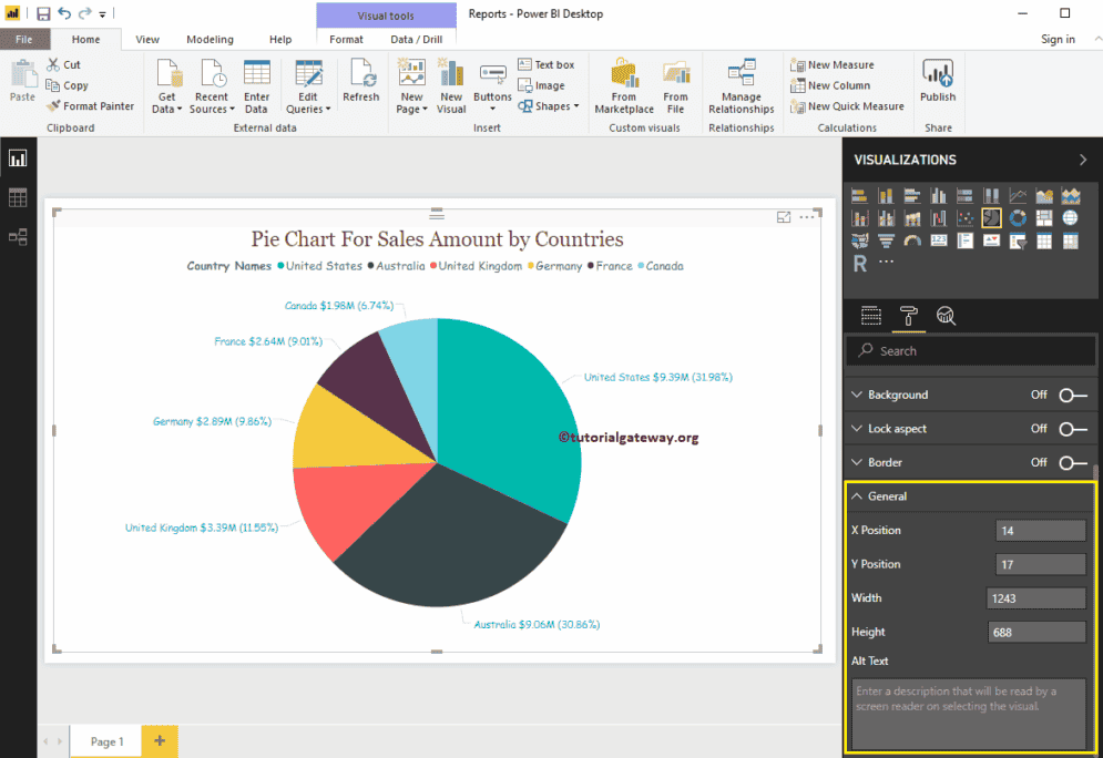 使用“常规”部分更改饼图的 X、Y 位置以及宽度和高度。