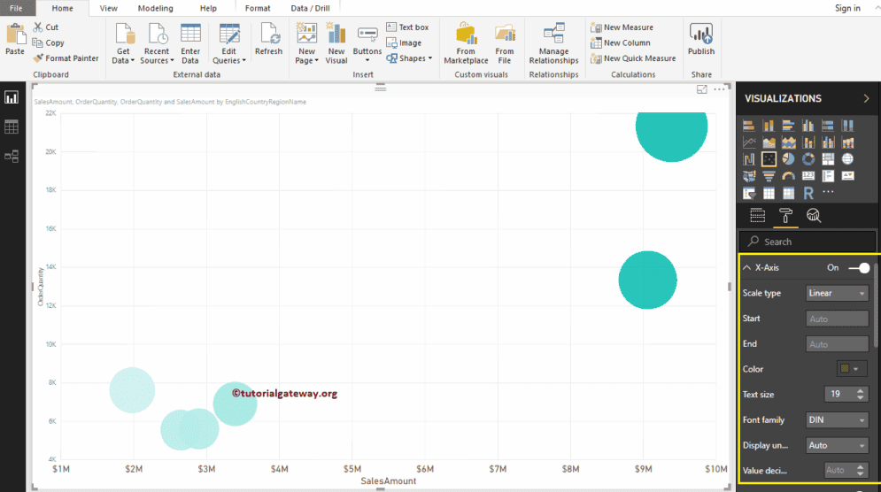 让我将轴标题从 SalesAmount 更改为 Sales Amount,标题颜色更改为绿色,字体样式更改为 Cambria,字体大小更改为 25。
