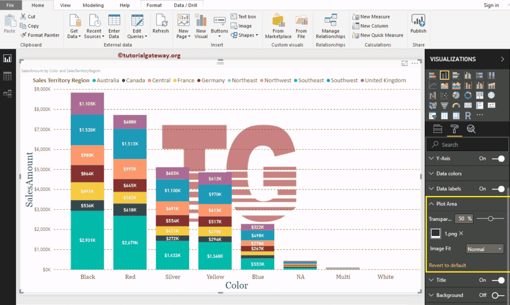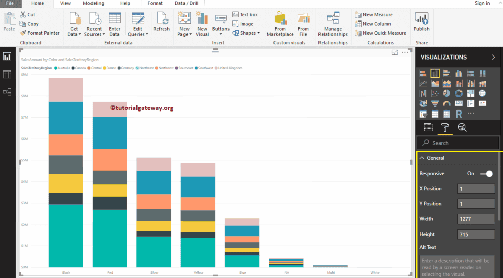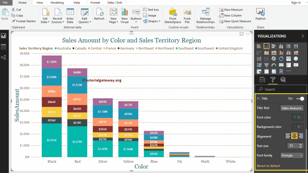 正如您从下面的截图看到的,我们将标题文本更改为“按颜色和销售区域划分的销售额”。我们还更改了标题颜色为绿色,字体系列为 Georgia,字体大小为 25,标题对齐方式为居中。如果您愿意,也可以为标题添加背景色。
