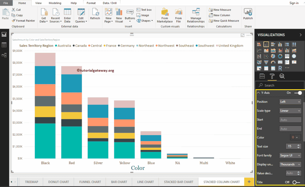 正如您从下面的截图看到的,我们将 Y 轴标签的颜色更改为棕色,文本大小更改为 15,显示单位设置为千。