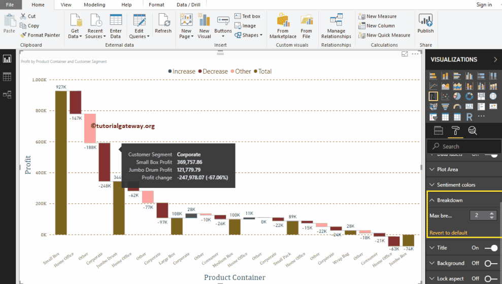 为了演示这些瀑布图格式化选项,我们将使用我们之前创建的瀑布图。请参阅 Power BI 中的瀑布图 和 图表 文章,以了解创建 Power BI 瀑布图的步骤。