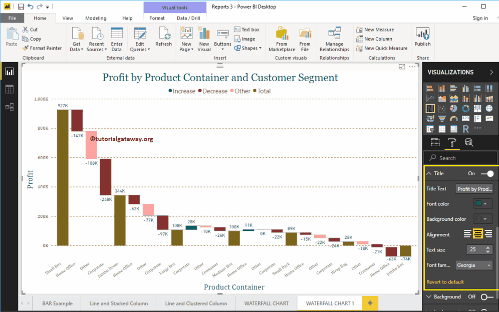 如何使用示例格式化 Power BI 瀑布图?格式化瀑布图包括更改条形图颜色、瀑布图标题文本、标题位置、Y 轴和 X 轴详细信息、数据标签和背景图像等。
