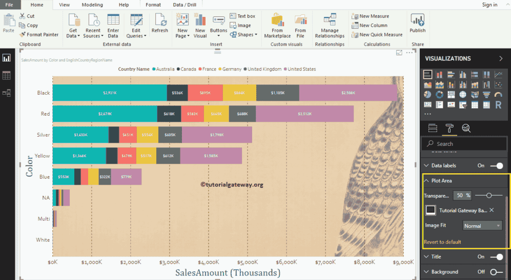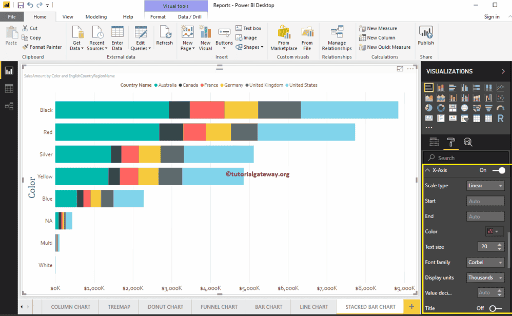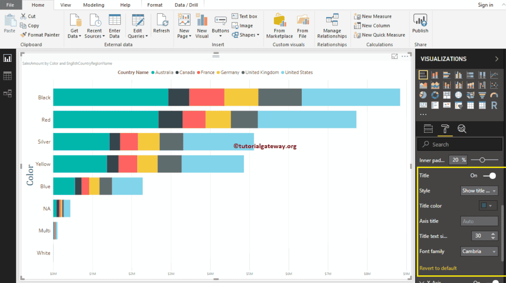 通过将“标题”选项从“打开”切换到“关闭”,您可以禁用条形图标题。正如您从下面的截图看到的,我们将标题文本更改为“按颜色和国家/地区名称的销售额”。
